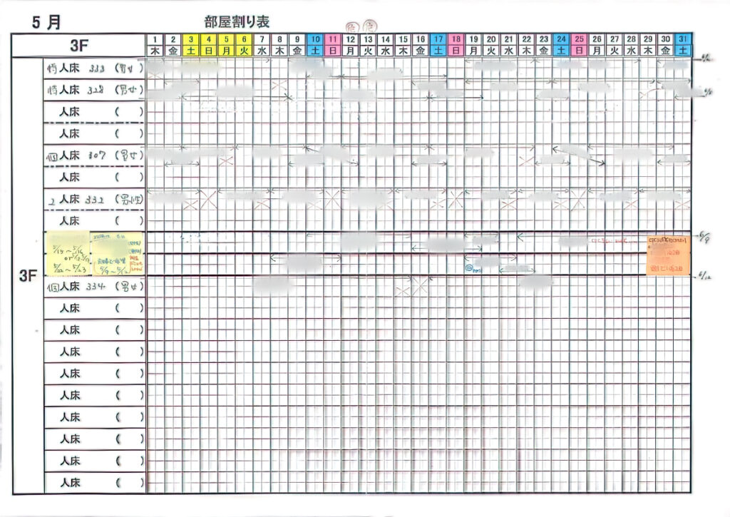 また、毎週末に、各フロアに共有するための翌週分の入退所一覧を作り、エクセルファイルでも共有していました。つまり、手書きの紙と、エクセルファイルの両方で情報共有をしていた形です。